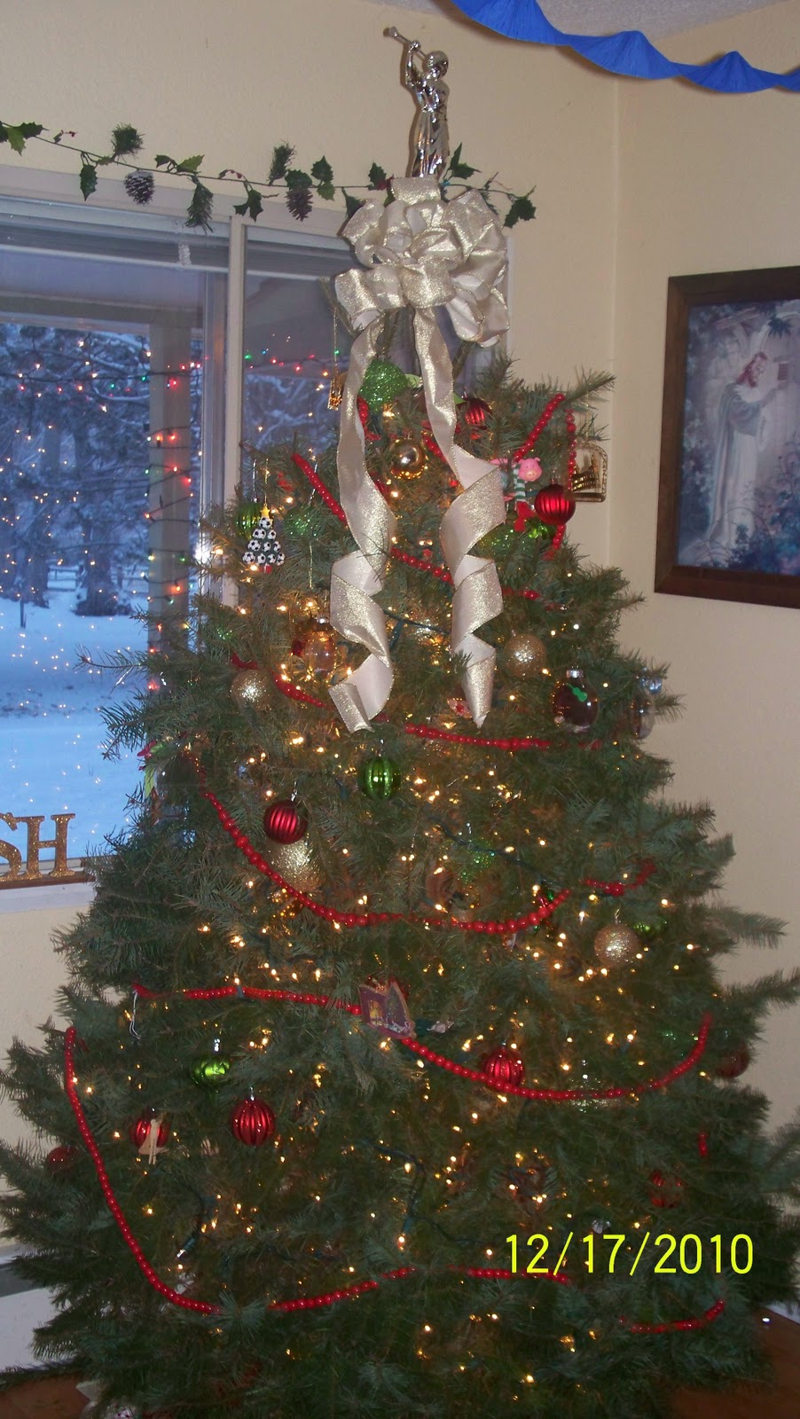 As perfect as our tree was to begin with, to me there was something missing. I really wanted red beaded garland. I just knew that would do complete the whole tree. I looked and looked and couldn't find any anywhere. It was getting very late in the season so I had pretty much given up and had decided that next year I'll start looking early. Well, one day I just happened to go into a new craft store near our home and they had my beaded garland on one of their display tree. So I looked through the store and nope, no beaded garland for sale. The store clerk then let me know that there was a 40% off sale on all Christmas decorations and I told him thats great but the only thing I want is on that tree right there. He took down the garland for me! I was super excited, I had my red beaded garland. But I only had 4 strands and our tree at home was bigger than the store display. Well, the next day I found 2 more strands for $.75 at the thrift store! I got home and put my tree together and of course, it was just the look I was going for. Now my tree was perfect!